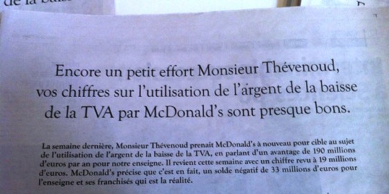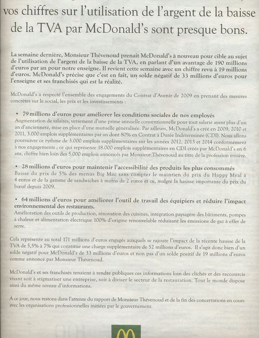 L’entreprise McDonald’s France attaqué par un Député sur les résultats de l’entreprise suite à la baisse de la TVA à 5,5 % dans la restauration, communique en pleine page de publicité dans les grands journaux Nationaux ( Libération, Le Figaro, Les Échos, Le Parisien, L’Équipe ). McDonald’s se livre à une réponse en délivrant une lettre ouverte adressée au Député Thévenoud auteur du rapport sur la baisse de la TVA dans la restauration récusant les chiffres énoncés par le Député.