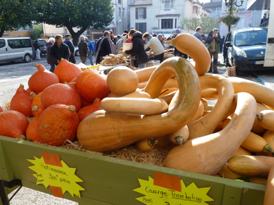 On y a retrouvé aussi sur des étals des potimarrons que l’on reconnaît à leurs couleurs orangés, également des Courge Trombolino que l’on nomme nous butternuts aux formes bizarres qui amusent les enfants.