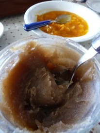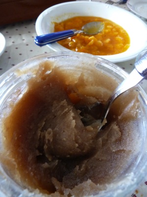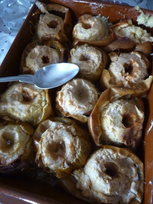 Les pommes reinettes ont fini au four saupoudré de sucre roux, quand à la crème de marrons maison elle accompagne un fromage blanc fermier battu et une marmelade de brugnons.
