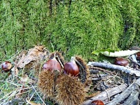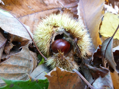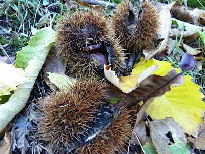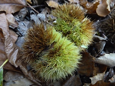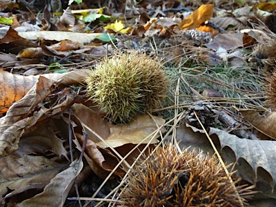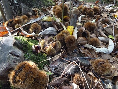 Ce n’est pas difficile à ramasser, mais il faut se munir de gant pour ne pas s’abîmer les doigts, d’un bâton pour fouiller dans les feuilles sèches, et pour ouvrir les bogues, un truc assez facile, il faut légèrement l’écraser avec un pied, l’enveloppe piquante s’ouvre et laisse apparaître les fruits.