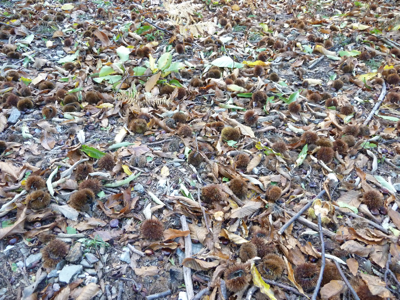 Quelques kilomètres en voiture pour rejoindre la clayère d’une des forêts de Châtaigniers qui boisent les montagnes avoisinantes. L’automne à déjà dressé son tapis de feuilles ambrées, sous les immenses châtaigniers, les coques sont déjà en partie toutes tombées, le sol est jonché de ces boules aux épines souples qui renferment les châtaignes.