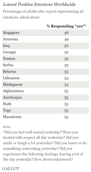 Malgré que les Afghans et les Irakiens aient traversé plusieurs années de guerre, ce sont les habitants de Singapour, cette cité-Etat prospère du sud-est de l’Asie, qui s’estiment les moins heureux, selon un sondage effectué par l’Institut Gallup au sein de 148 pays pour évaluer le moral des gens.
