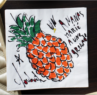 L’ananas et la grenade sont ses fruits préférés visuellement. L’ananas est très architectural, c’est un fruit, mais il pourrait presque ressembler à une maison. Il peut être une décoration que vous mettez sur une table, il adore la partie feuille, cela lui rappelle le chapeau que portaient les showgirls.