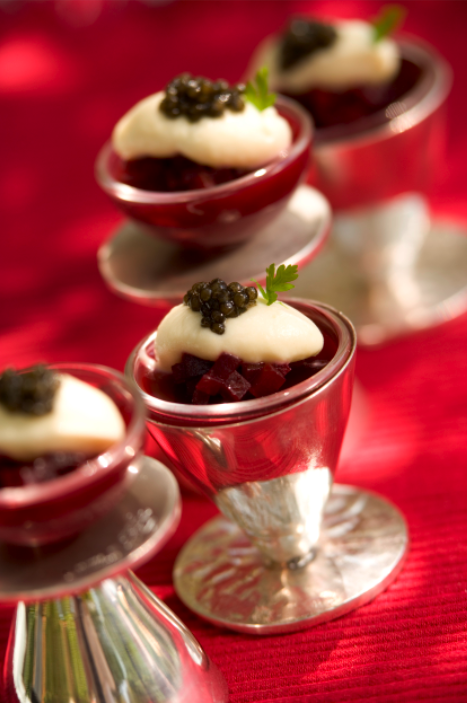 Couler la gelée de betterave dans des récipients au choix. Une fois prise, disposer dessus un peu de brunoise de betterave. Surmonter d’une quenelle de purée de chou-fleur. Terminer avec une pointe de caviar.