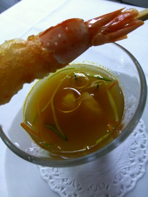 quenelle de Saint-Jacques, queue de gambas en tempura.