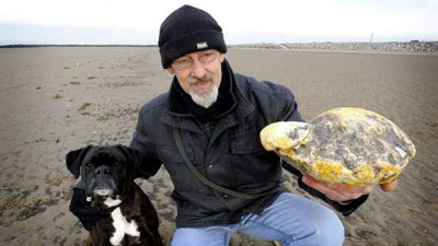 Ken Wilman promenait sa chienne Madge sur une plage de Morecambe (nord-ouest de l’Angleterre) quand celle-ci s’est arrêtée sur une « grosse pierre » grise et jaune à la texture cireuse. Dans un premier temps, il a continué son chemin mais « quelque chose a fait mouche dans mon esprit », a-t-il dit à la BBC.