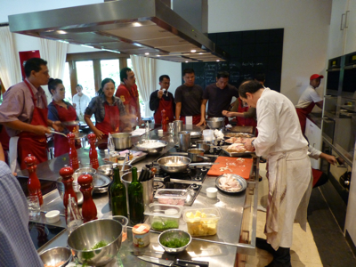 Après la séance très instructive du » Poulet de Bali en vessie « , nous retrouvons le chef Hollandais Alain Caron en cuisine pour un atelier autour de ses recettes. Présentateur de MasterChef et MasterChef junior en Hollande, Alain Caron est avant tout un chef d’origine française qui au delà des médias passe son tablier pour partager sa passion et son métier – la cuisine -