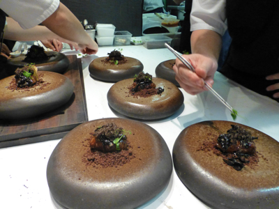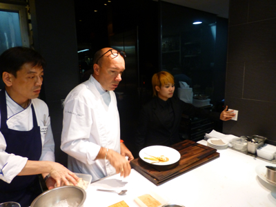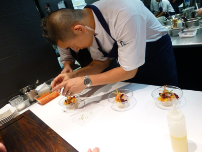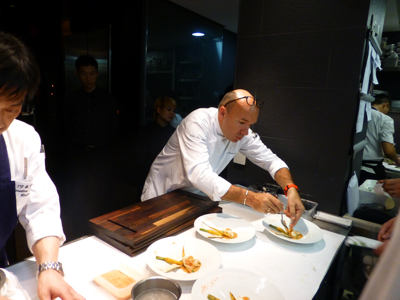 Les chefs trouvent vite le rythme, à Singapour comme un peu partout en Asie les premiers clients sont à table de bonne heure…dès 19 h les plats commencent à sortir des cuisines. Chacun y va de sa cuillère, de son tour de main, de son grain de sel, les assiettes se composent sans arrêt, le menu servi ces deux soirs est composé d’une bonne vingtaine de préparations, il ne faut aucune attente entre les plats.