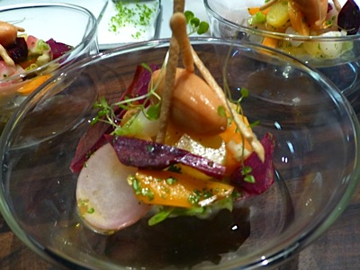 Les » légumes racines » fondants et savoureux vont la jouer » à la Grecque « , tuiles au vinaigre et sorbet tomate/ananas pour l’occasion.