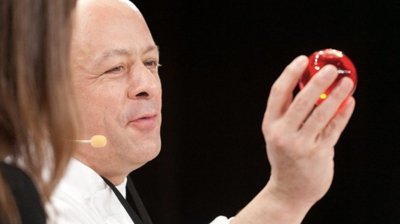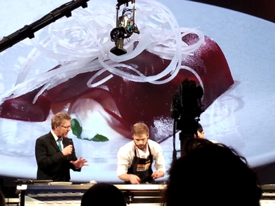 Il est ici chez lui, il joue à domicile. Il clôture le festival. Il va parler de cryogénisation, de cryoconcentration, de réflexion sur la matière, il recherche de la cuisine de demain, ont est ailleurs, la scène food version une autre planète. Il fait monter sur scène Bruno Goussault, inventeur du sous vide. Il fait circuler dans les rangs – enfin, on peut goûter – du lait de sole, du jus de veau… On essaye de comprendre.
