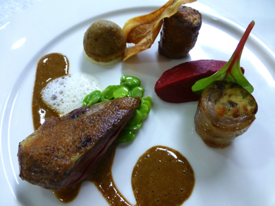 La poitrine de pigeon rôti, sa cuisse glacée en ballottine, douceur de betterave, jus de pigeon aux févettes, crouton façon rôti, chips de panais.