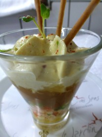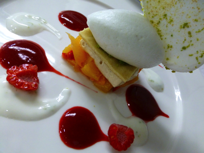 La fraicheur de fruits rouges et agrumes, fin sablé à la crème de touron, sorbet mousseux au basilic, yaourt au citron vert.