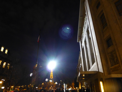 Maison Blanche et le Théâtre des Champs Élysées sous la lumière de la Tour Eiffel.