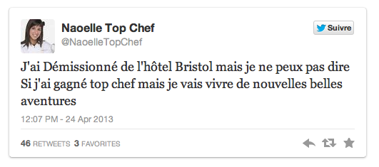 Ce mardi midi, Naoelle a finalement confirmé son départ du Bristol sans révéler si elle est bien la grande gagnante de Top Chef 2013.