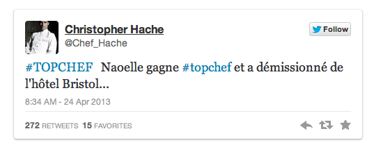 Ce mercredi, c’est un petit tweet assassin qui a mis le feu aux poudres. Le chef étoilé Christopher Hache qui officiait dans les cuisines du Crillon avant sa rénovation a révélé le nom du gagnant de la finale :