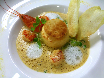 Le biscuit moelleux d’écrevisses en croute de pain, petits légumes du printemps au cerfeuil, poêlée de queues d’écrevisses minute, bouillon façon bisque en émulsion, chips de pommes de terre.