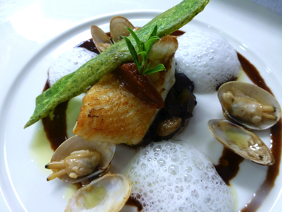 leur jus de cuisson en réduction, suc de tomate acidulé, palourdes de Camargue en marinière.