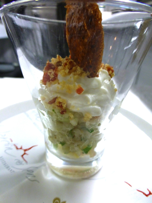 crème de chèvre et crumble de chorizo et tomate, tuile à la tapenade.