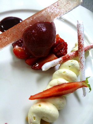 sablé à la mousse légère citron et croustille de meringue, sorbet aux cerises et son coulis.