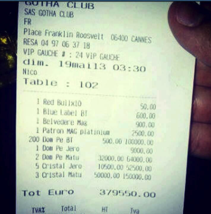 Samedi c’est au Gotha Club ( concurrent du VIP pendant cette quinzaine ) que tout s’est emballé. Dans un tourbillon de Champagne Dom Pérignon et Crystal, Magnum, Jéroboam , certains records de dépenses ont étaient approchés. La clientèle étrangère, venue en masse cette année encore, a largement fait flamber les ventes, comme en témoigne une facture diffusée sur le net où un amateur de grande fête a réglé pour 379550 euros de boissons.