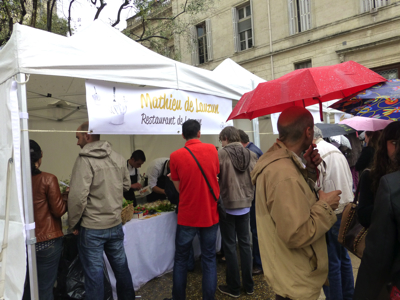 C’était un temps d’hiver qui sévissait sur Montpellier, la place située devant la Préfecture de Montpellier avait été investie par les chefs et leurs tentes où des cuisines de circonstances avaient été installées. Chacun des chefs préparait une verrine esprit tapas pour 600 personnes. Le public avait acheté par avance des carnets d’une valeur de 22 euros, chacun des dix tickets donnait droit à un plat, les vignerons de Pays D’Oc s’étaient aussi associés à l’opération pour fournir le vin aux participants.
