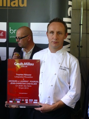 Le Trophée suivant touchait à plusieurs titres les Frères Pourcel, puisqu’au delà de son thème la pâtisserie, c’est le chef pâtissier du Jardin des Sens qui fut récompensé. Le « Trophée du chef Pâtissier » fut décerné donc à Jean-Christian Chevalier qui oeuvre depuis de nombreuses années au Jardin des Sens. C’est Marc Esquerré et le chef Wout Bru qui lui remirent le Prix.