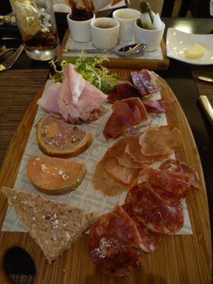 La planche de cochonaille et charcuterie était totalement à propos, il faut dire qu’elle n’a pas fait long temps, un bon beurre, du bon pain et quelques condiments, on n’a pas pu résister.