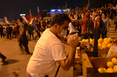 Alors, maintenant par habitude, la police lance des gaz lacrymogène sur les manifestants qui sont à 100 m, certains vendeurs de kebab ambulants servent munis d’un masque chirurgical et continuent à trancher la viande. Dans les restaurants des quartiers environnants la place Taksim, on plaisante en disant que l’on va » avoir sur sa nourriture un spray au poivre, qui vous fera pleurer en mangeant « .