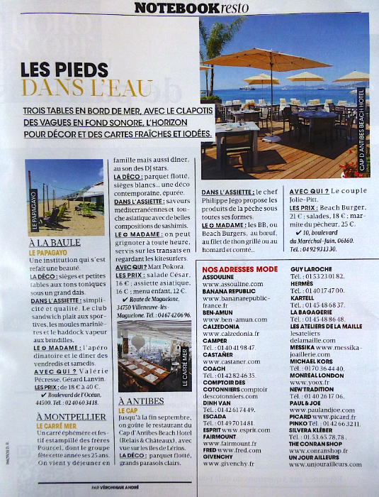 - Madame Figaro – de ce Week-End, sous la plume de V. André, vous délivre les trois adresses incontournables des restaurants de plage de l’été, suivez un itinéraire qui va vous mener de La Baule à Montpellier puis sur Antibes.