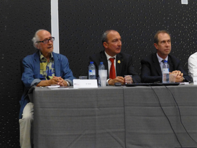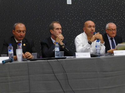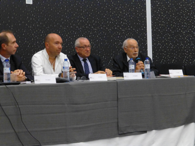 À la table des intervenants, le chef Jacques Pourcel, le pâtissier/chocolatier Bernard Cabiron, Michel Hermet propriétaire du Wine Bar le Cheval Blanc à Nimes et Président de l’UDSF ( Union Des Sommeliers de France ).