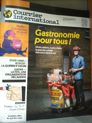 » Gastronomie Pour Tous ! Moins élitiste, moins chère, la grande cuisine descend dans la rue » c’est la couverture de l’hebdomadaire » Courrier International » de la semaine du 3 au 9 octobre.