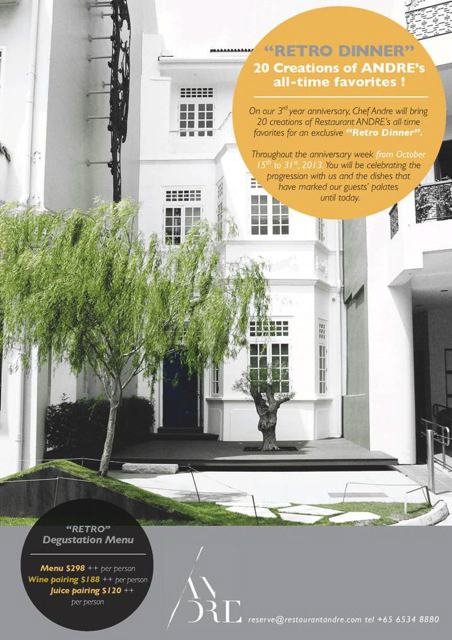 Le restaurant « André » à Singapour du chef André Chiang fête ses trois ans. Les frères Pourcel étaient sur place pour fêter les deux premiers anniversaires. Pour le troisième anniversaire le chef André Chiang reprend sur deux semaines ses 20 créations culinaires favorites, un fabuleux » Retro Dinner » sera donc présenté à cette occasion. Nul doute que les chanceux qui pourront se rendre à Singapour à cette période là vont vivre de grandes sensations.