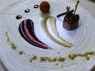Chevreuil en côtelette, velours de cèpes, jus griotte-réglisse