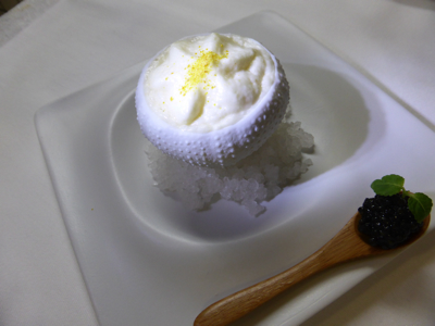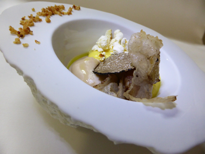Crème de châtaignes, nuage de maïs, chips de lard Colonata.