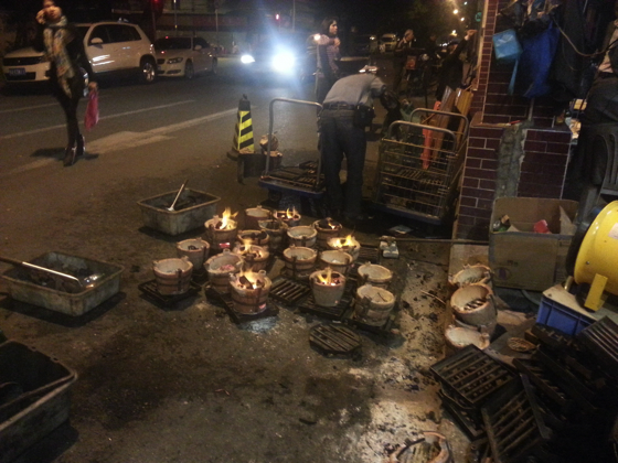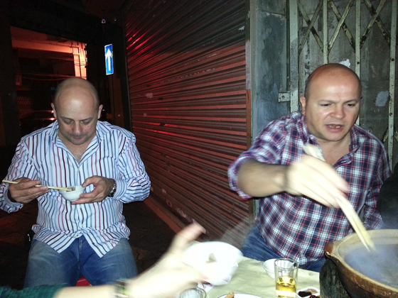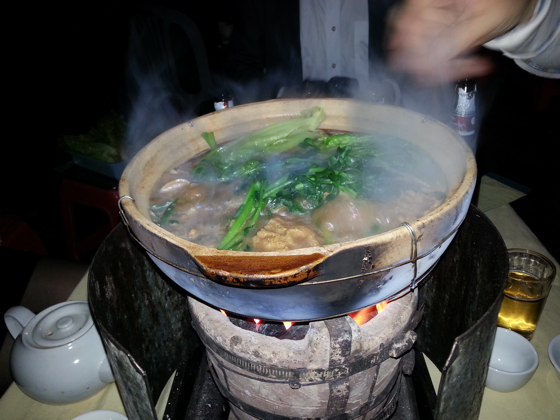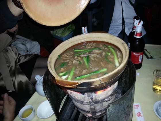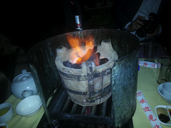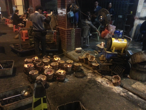 C’est accompagné de quelques chefs de cuisine que nous avons débarqué dans une adresse conseillée par un chef local. A proximité on repère facilement l’endroit, les trottoirs débordent de tables, de nombreux clients s’y pressent, et au milieu la rue se prépare le feu qui va alimenter les chaudrons de terre où seront posés les cocottes. Ces plats traditionnels d’hiver font penser à la fondue française, c’est très populaire en Chine.