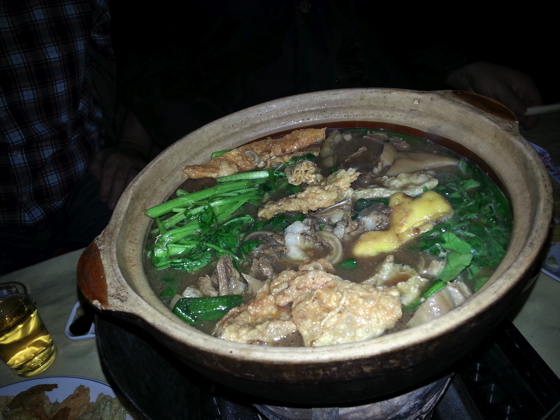 Ce soir là, c’était de l’agneau au menu ( peut-être du mouton d’ailleurs ). Les pots de terre arrivent sur la table déjà remplis de bouillon où frémit l’agneau. Les morceaux de viande mijotent déjà depuis quelques heures. Quand on dit morceaux d’agneau il faut comprendre qu’il y a toutes les parties de l’agneau, viande bien sûr, mais aussi couenne, abats…. rien ne se jette, la surprise est aux bout des baguettes !
