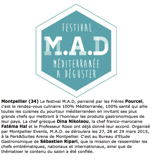 Le MAD, c’est l’évènement » Méditerranée à Déguster » un nouveau salon thématique qui verra le jour en 2015 à Montpellier, et qui sera le reflet des tendances de la cuisine d’aujourd’hui dans tout le bassin Méditerranéen. Les fondations ont été posées ces derniers jours par » Montpellier Évents » qui aura en charge d’organiser ce Festival de la Cuisine en Méditerranée et dont le programme vous sera dévoilé tout au long de cette année.