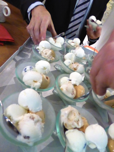 Ci-dessus Ludovic Regnier producteur d’huîtres sur le Bassin de Thau au Domaine de Mourre Blanc à Mèze, ostréiculteur atypique qui cultive ses huîtres en suspension. Puis François Collard et son épouse propriétaire du Domaine viticole familial – Château Mourgues Du Grès – déjà une très belle référence dans les Costières de Nîmes, un domaine très attaché à la préservation du terroir et de l’environnement et qui produit des vins d’exception. Dégustation également des glaces au lait de brebis de Carine Bossut de La Ferme du Bosc à Mayreville.