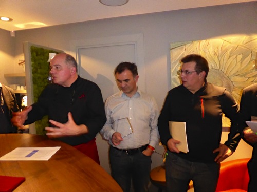 Ci-dessus les chefs Romain Salamone du restaurant » Sensation » à Lattes, le chef Franck Putélat du restaurant » Le Parc » à Carcassonne, et Charles Fontés le chef de la » Réserve Rimbaud » à Montpellier. En-dessous le chef Michel Kayser et Philippe Quintin. Les dégustations étaient lancées, les critères de notations sont indiqués, les chefs vont pouvoir se mettre au travail.