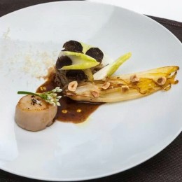 Les pétoncles de mer » à la plancha », endives braisées au vieux vinaigre et truffes noires