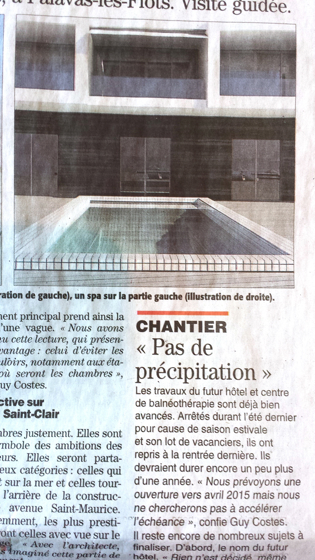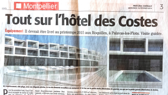 » Tout sur l’hôtel des Costes » c’est ainsi que titre sur le quotidien Midi Libre de ce mercredi 13 mars un article signé Karim Maoudj qui fait un point sur les célèbres Frères Costes du groupe de restaurant Costes à Paris qui ouvrent à Palavas-les-Flots un hôtel et centre de balnéothérapie en 2015.