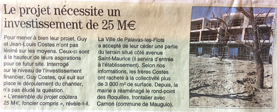Le projet est évalué à 25 millions d’euros foncier compris indique le journaliste, des terrains ont été rachetés à la commune de Palavas-Les Flots pour donner plus d’envergure au projet, la Mairie quant à elle a réaménagé les accès avec notamment un rond-point.