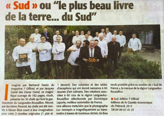En dernière page de ce tirage spécial Sud de France, un tiers de la page était consacré au livre SUD dont nous avons longuement parlé sur le blog F&S. Ce livre, parrainé par les frères Pourcel et imaginé par Jacques Cairel caviste à Montpellier et Bertrand Fassio du magazine 7Officiel, regroupe 30 chefs sélectionnés dans le Languedoc Roussillon qui font la cuisine du sud d’aujourd’hui. Une sélection de 60 vins faite par Dominique Laporte anime les plats de chacun des chefs, un belle vitrine pour le terroir de notre région et pour les chefs.