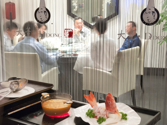 Chaque restaurant de Da Dong emploie une centaine de personnes. Seuls les hommes d’affaires et les expatriés (ici dans un salon privatif) peuvent accéder à ses spécialités. Il faut compter soixante euros par personne, soit un dixième du salaire mensuel moyen à Pékin. Le pays est passé de l’ère du « manger à sa faim » à celle du « bien manger ».