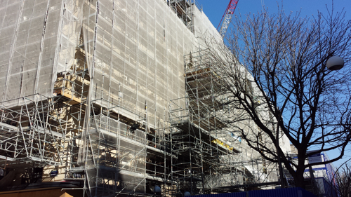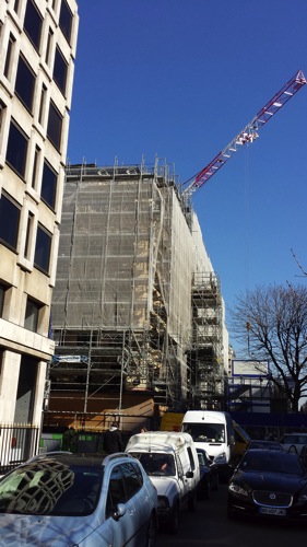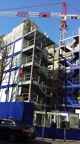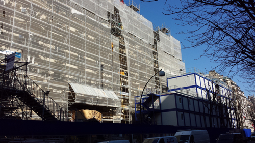 À première vue, on pourrait se demander qu’est ce qu’il se passe, puis on reconnait par transparence les fameuses façades classées du Plaza Athénée. Effectivement le Palace parisien aentrepris depuis le mois d’octobre dernier un relooking extrême.