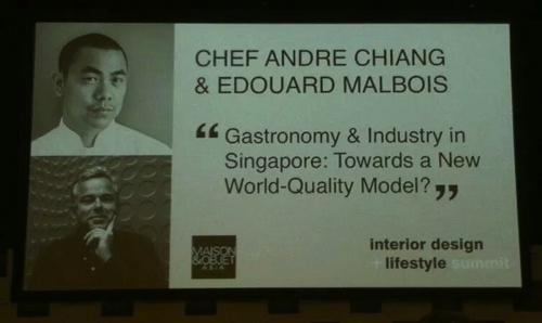 L’alimentation joue un rôle majeur dans la réflexion de l’identité de Singapour. Qualité, savoir-faire, la demande pour de nouvelles expériences ou concepts, Singapour devient un nouveau modèle dans la Gastronomie et l’industrie alimentaire et l’innovation. Edouard Malbois de l’agence de design Enivrance, qui a crée un vraie bureau de style, et le chef André Chiang du restaurant André à Singapour, classé 6 éme Meilleur restaurant d’Asie, ont apporté chacun leurs points de vue sur les développements à venir .