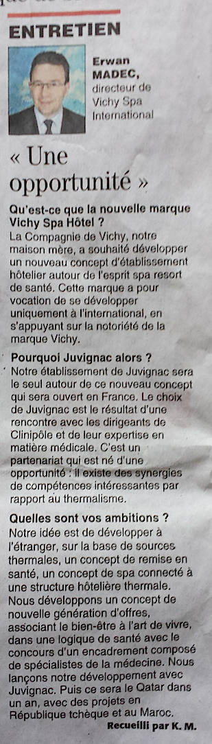 Quand à Vichy, au travers de sa société – La Compagnie de Vichy – apporte au projet son savoir faire, son process tourisme/santé et ses méthodes de soins.
