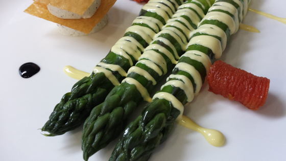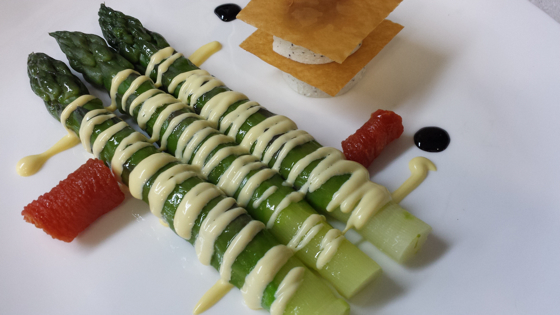 Assaisonnez les asperges avec un mélange d’huile d’olive, d’une pointe de sel, d’un trait de citron. Disposez-les sur les assiettes à côté du mille feuille. Tracez les asperges de vinaigrette au jaune d’œuf.
