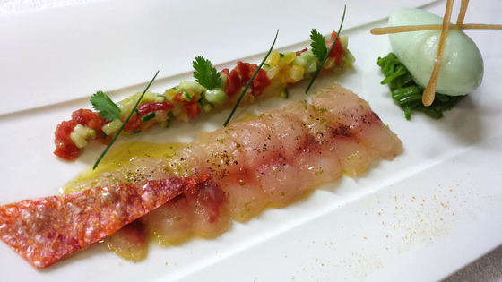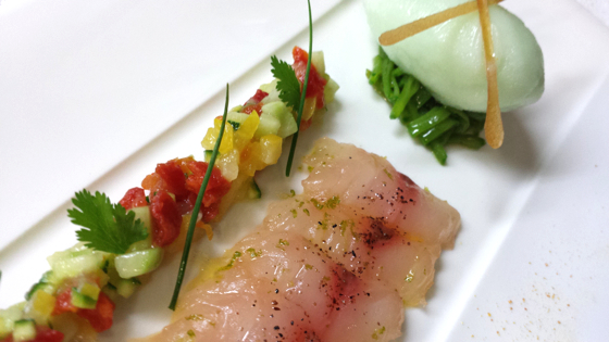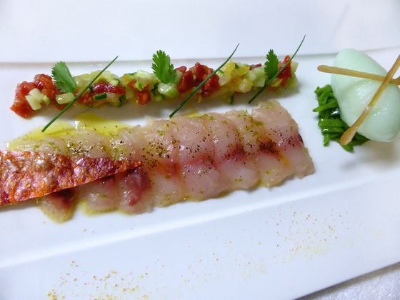 Sashimi de rouget au citron vert, condiment concombre/tomate, sorbet fenouil, tuile au vinaigre