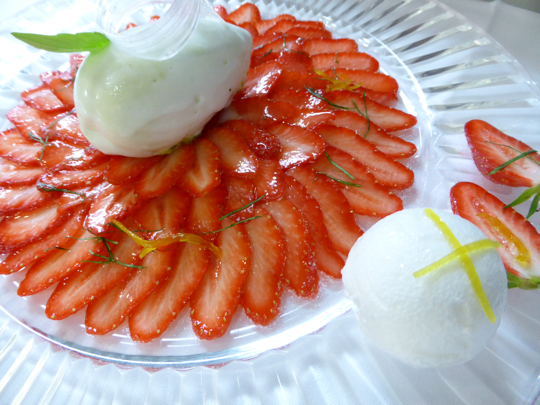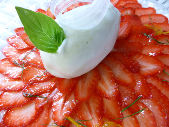 Le carpaccio de fraises de pays, citron et basilic, blanc d’oeuf en neige, sorbet mousseux au basilic.